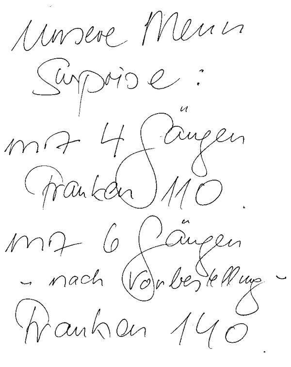 Unser Restaurant ist von Donnerstag bis Samstag ab 18 Uhr und am Sonntag ab 17 Uhr geöffnet.